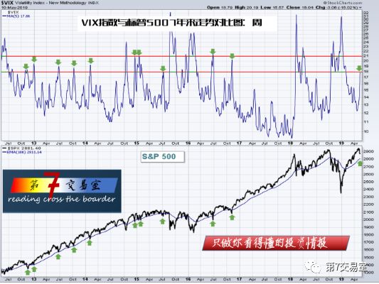 每当VIX上攻到18到21点位区间内时,标普总会出现一波下跌,而且相对应的指数点位常常在中短期的底部,