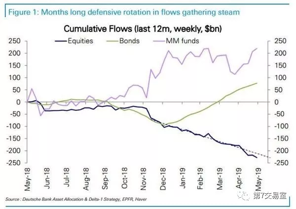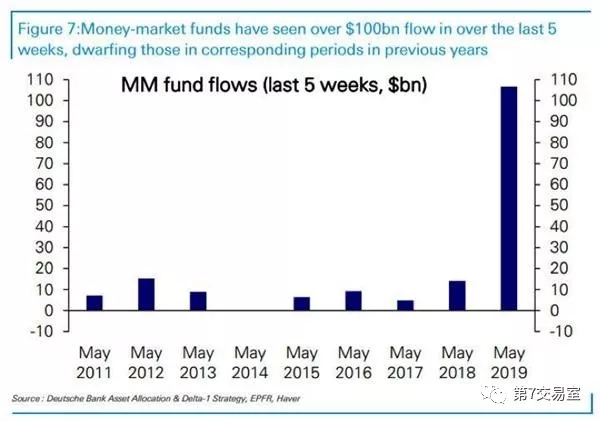 本周最新的德银研报给了市场资金流向一副大致的图景:据其统计,上周股市资金离场的情况持续。股市一周减少了约100亿美元资金,债券市场则小幅流入,货币市场基金流入了近130亿美元。
