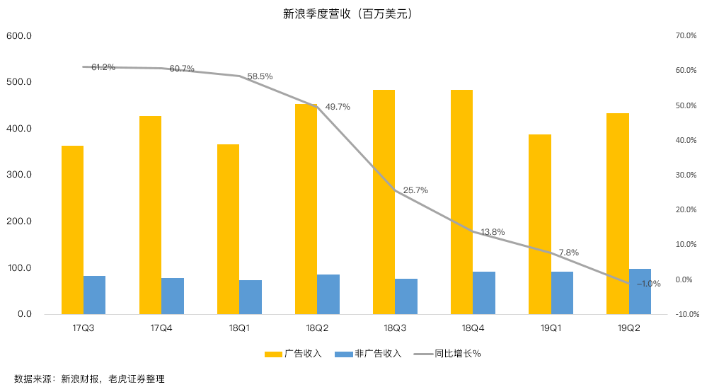 对于严重依赖广告收入的新浪来说,营收下滑的趋势已经非常明显了,自2017Q3以来,营收增速已经连续七个季度出现下降,这与股价的走势基本吻合。而本季度营收同比下降1%,是自2010Q1以来首次负增长,直接原因便是广告业务熄火。