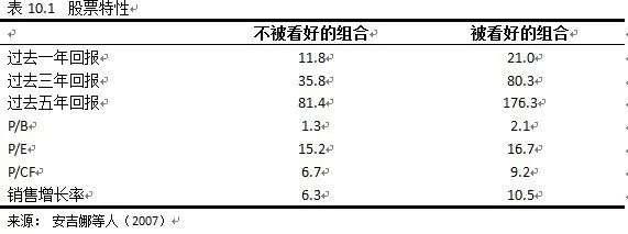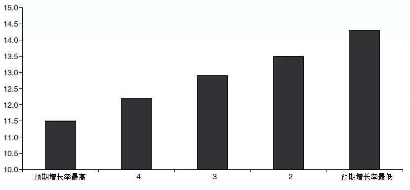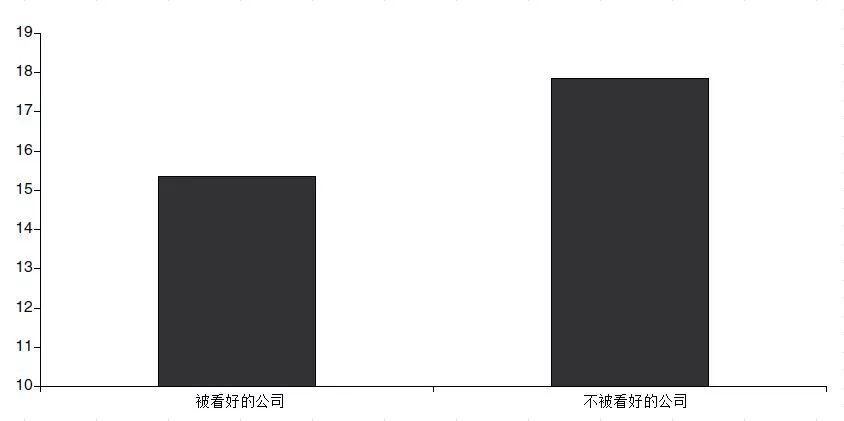 为什么会出现这种情况?背后在于我们的“惯性思维”。由于这些公司在被选出来的时候,往往过去几年的表现都很好。所以他们往往对应更高的估值。这个估值可能隐含了未来几年持续的高增长。也就是说,即使公司实现了高速业绩增长,但未必继续在股价中有更好的表现。从下面这张图我们看到,被看好公司的组合,明显对应更高的估值水平。