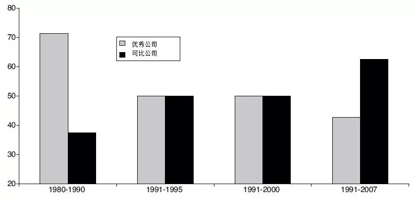 下面这张图显示了优秀公司和可比公司战胜标普500的比例。我们看到,在此书出版的时候,大部分优秀公司在1980到1990年战胜了标普500指数,而可比公司中只有不到40%的比例战胜了指数。但是到了1991到1995年,这批优秀公司战胜市场的比例和可比公司一样了。如果把时间拉长,从1991到2007年,优秀公司战胜标普500的比例低于50%,而可比公司大约有70%比例战胜了市场。