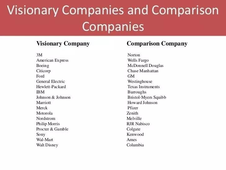 《基业长青》的英文名字叫做:Built to Last:Successful Habits of VisionaryCompanies. 显而易见,这些公司应该是能长期存在,并且书中的本意是如何向这些伟大的公司学习。在这本书中,作者柯林斯和波拉斯希望寻找到能跨越时间长河的企业,并且透视其长期成功背后的商业模式。他们先从200多个不同行业的龙头企业着手,进行层层筛选,最终留下了这18家在全球范围内最优秀,护城河最深的企业。这批企业,就是《基业长青》中的伟大公司(VisionaryCompanies)。然后在每一家伟大公司旁边,他们也放了一个并不算伟大的好公司。比如说,宝洁是一家伟大公司,对比的高露洁是一家优秀但还不伟大的公司。下面这张图是伟大公司和可比公司的名单。