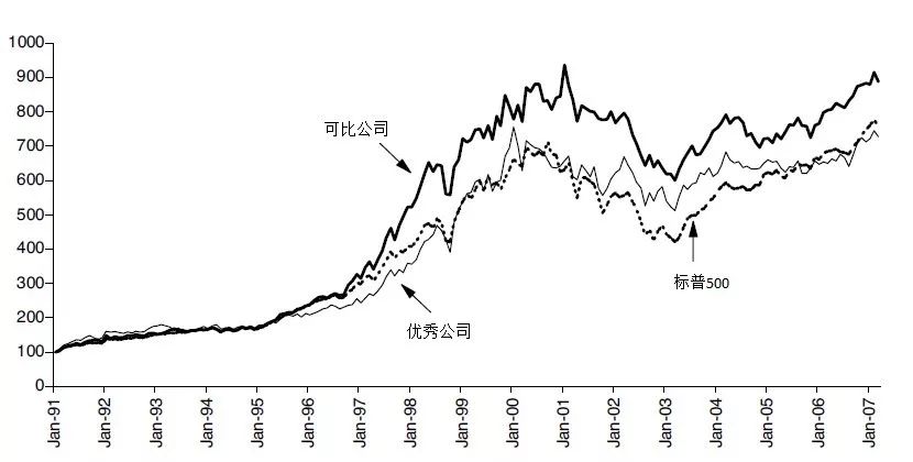 下面这张图是1991年到2007年之间,优秀公司、可比公司以及标普500指数的表现。我们看到在此期间,优秀公司年化收益率13%,是跑输标普500的14%年化收益率的。而可比公司却创造了14.6%的年化收益率,战胜了市场和优秀公司。这个收益率,是在前几年他们表现落后的背景下获得的。
